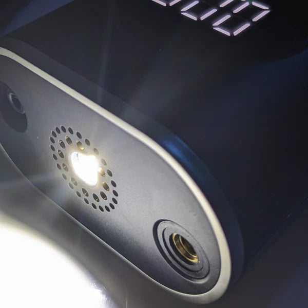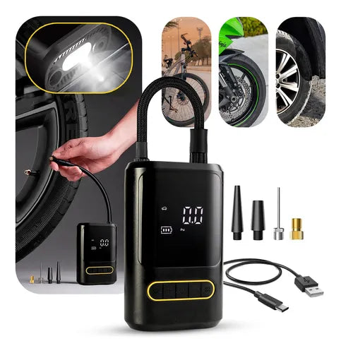 Con su pantalla digital precisa, linterna LED integrada y múltiples boquillas adaptadoras, puedes inflar neumáticos de carro, moto, bicicleta o balones — sin cables y sin complicaciones.